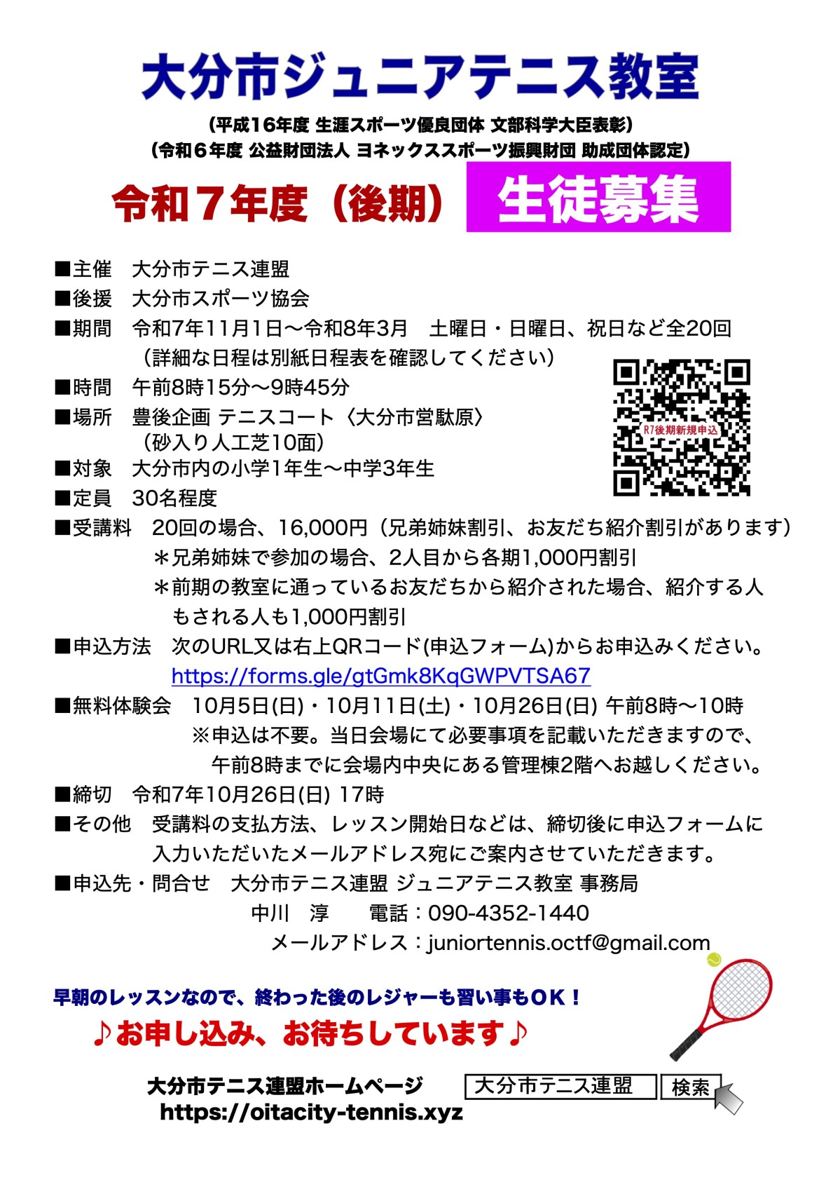 大分市ジュニアテニス教室がどのような教室なのかを知っていただく機会とし、10月5日(日)、11日(土)、26日(日)に無料体験会を予定しています。